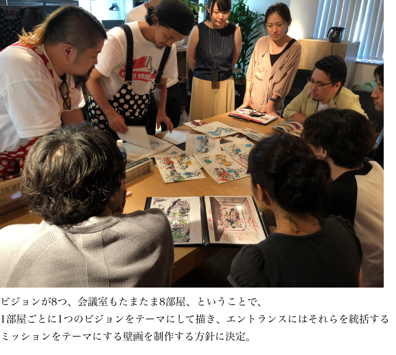 各会議室にミッションを描いてきた。エントランスではそれらを統括するビジョンの壁画を制作した。