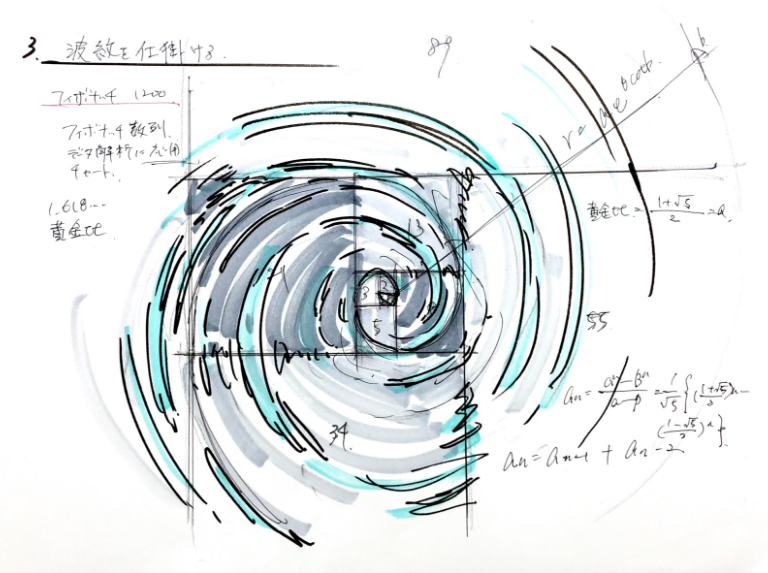 壁画の波紋は人間が発見した数式をもとに描いた。